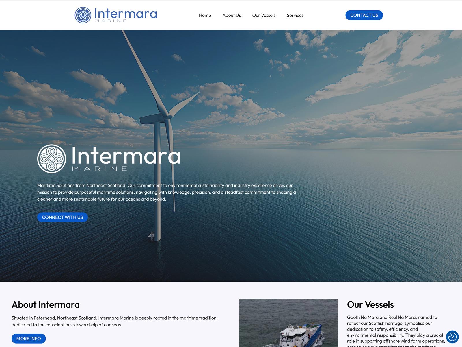 Intermara Marine is a Scottish maritime services company focused on supporting the offshore renewable energy sector. Based in Peterhead, the business operates purpose-built vessels and delivers specialist support services to wind farm projects and other offshore operations. The goal of the website was to create a professional, technically precise and trust-led digital presence that clearly explains the company’s offerings to commercial clients and industry stakeholders.